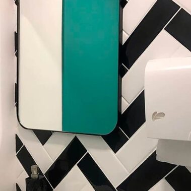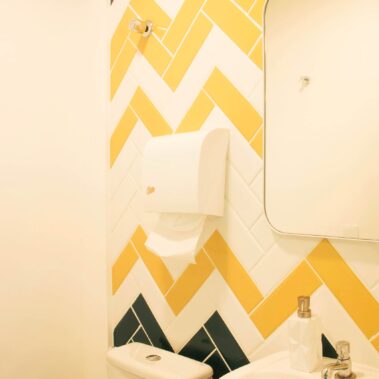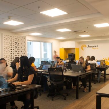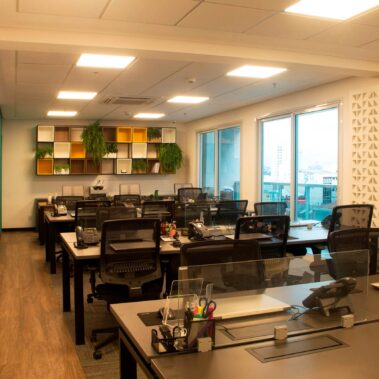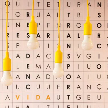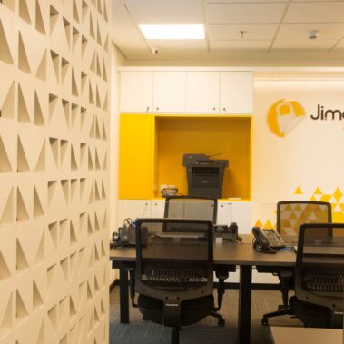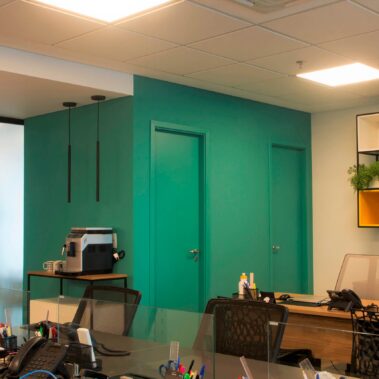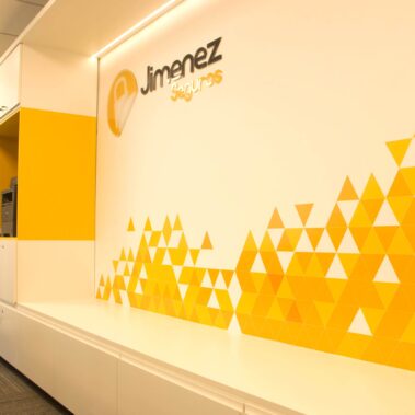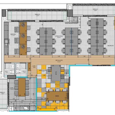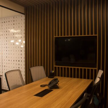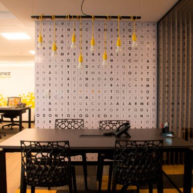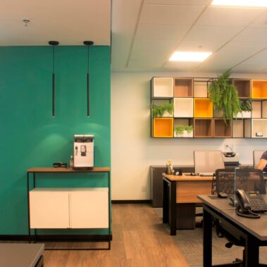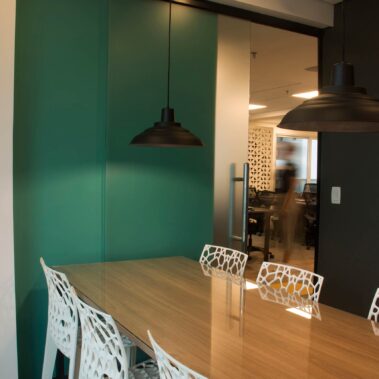Usamos sobre uma base branca nas paredes e mobiliários mais escuros, muita cor e elementos lúdicos, como o painel adesivo de caça palavras. Os lockers também foram um mobiliário sobre o qual tentamos brincar sobre o branco, trazendo elementos amarelos. Neste mobiliário, foi desenhado um banco central e, sobre ele, a logomarca da empresa, já que está bem na entrada do conjunto e poderia também funcionar como uma espera, já que não havia necessidade de uma recepção formal.