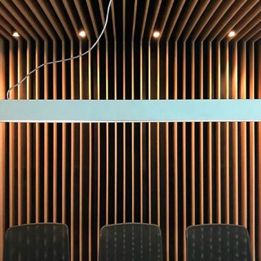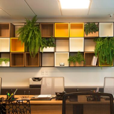 Outros elementos interessantes do projeto são o painel com desenhos vazados para fechamento do rack, que fica bem junto das mesas de trabalho, e a estante de nichos para objetos e vasinhos de plantas, que trouxeram um brilho e vida a mais para o ambiente.