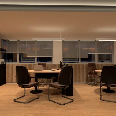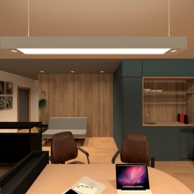 Além das mesas e armários que foram reaproveitadas, criamos uma espécie de moldura para eles, com estruturas em mdf preto e serralheria. Desenhamos um painel em “L” em azul e madeira clara que contorna o volume do banheiro e cria uma pequena copa. Atrás do sofá de recepção e das mesas, criamos painéis em madeira ripada, os quais, além de trazer calor para o ambiente, ajudam a manter por mais tempo a pintura. Para setorizar melhor recepção e mesas de trabalho, criamos um aparador que, além de divisor, é mais um local para armazenar a papelada.