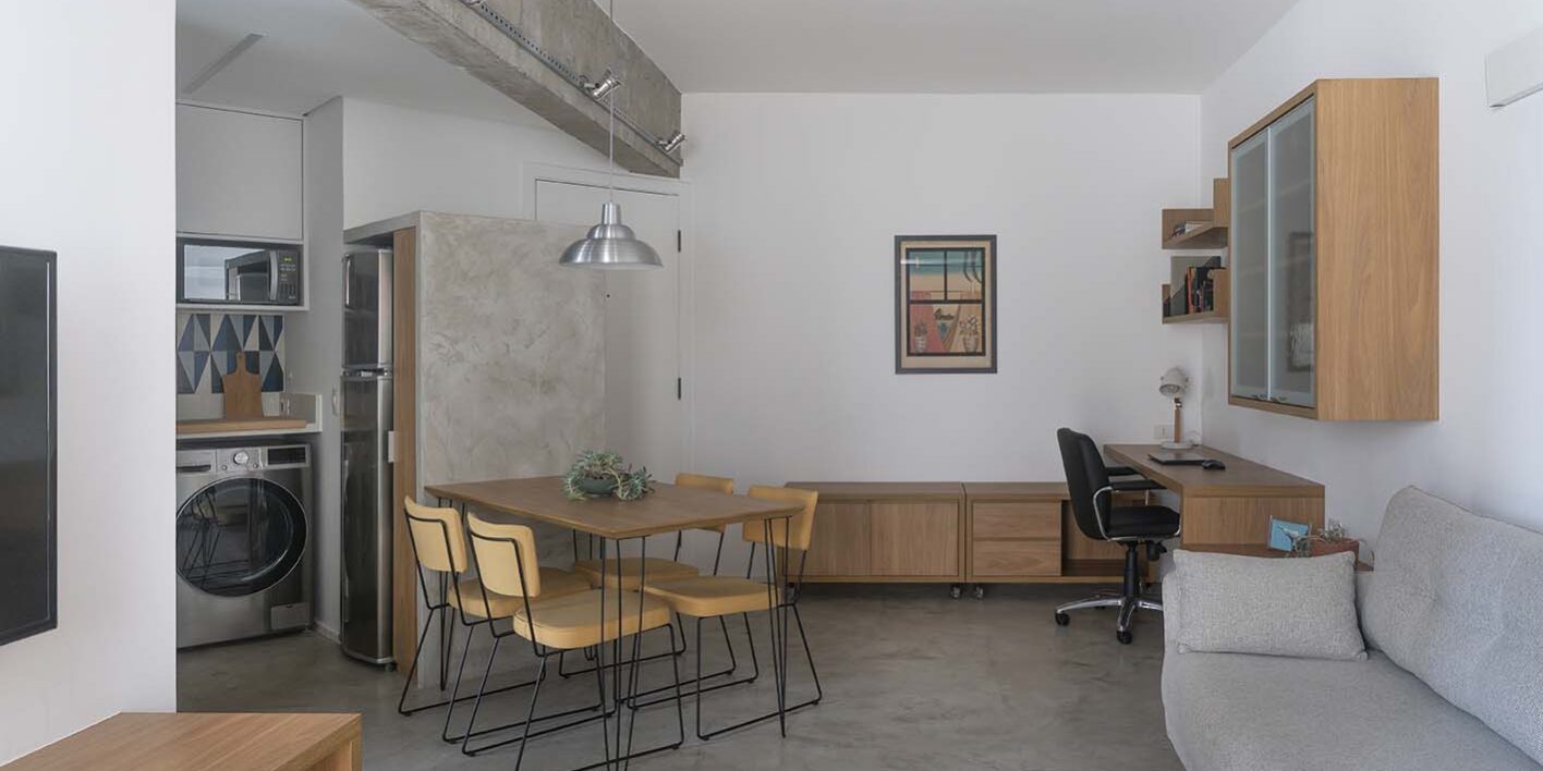 A principal alteração de layout se deu na cozinha, onde mudamos a posição de tudo para conseguirmos encaixar um máquina lava-roupas, ainda assim aumentando a área de bancada, que era inexistente, e possibilitando também que a mesa de jantar saísse do meio da sala para ganharmos uma área de home-office generosa, tão importante durante a pandemia de COVID-19.
