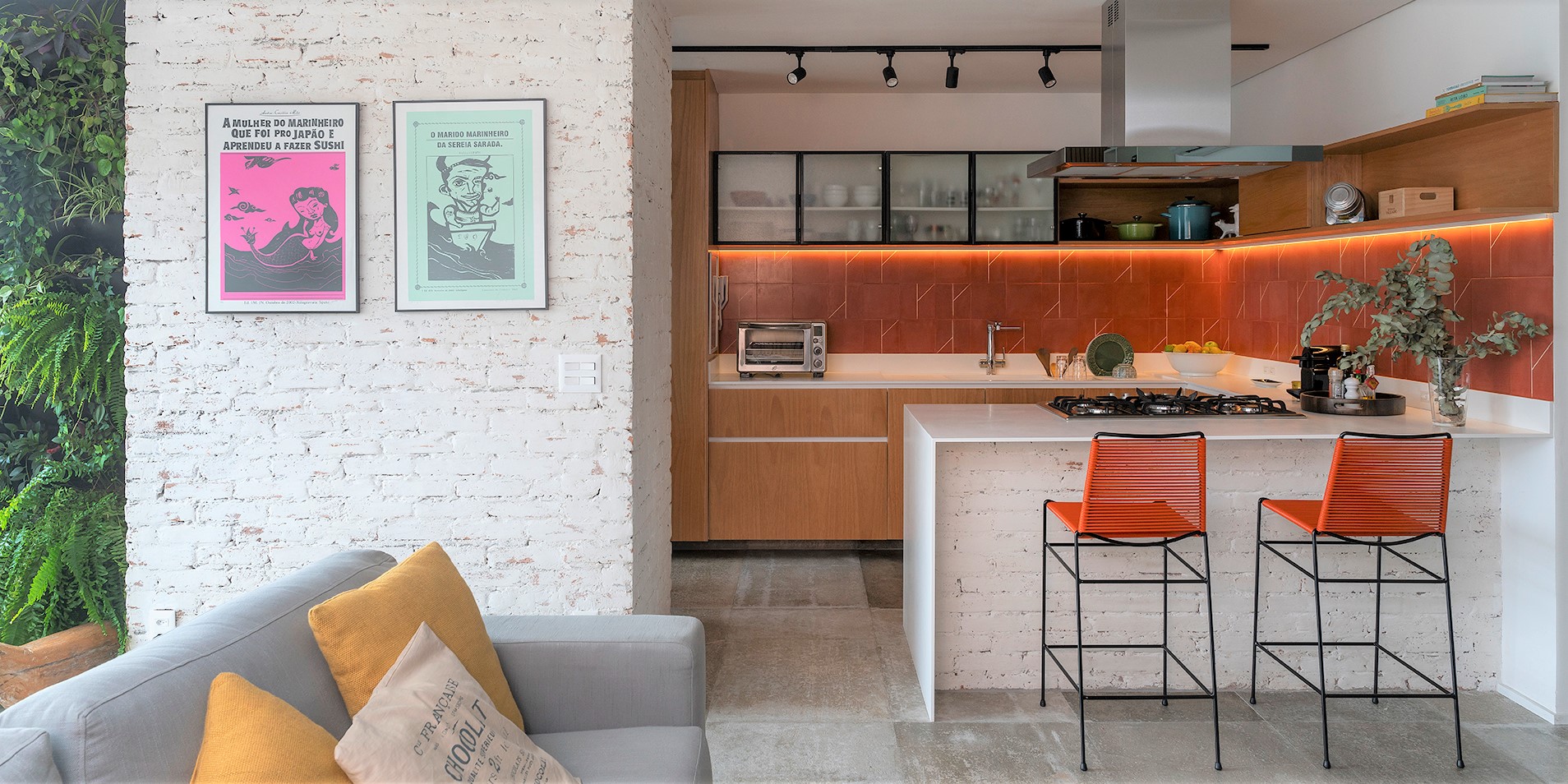 A integração da sala com a sacada e a cozinha permitiu um espaço livre e conectado e uma ampliação das bancadas de trabalho da cozinha, fator de extrema relevância para as proprietárias. O uso da cor se localizou mais na cozinha, mas com a planta livre, essa cor se espalha por todo a área social. A luz, que entra pela sacada, também banha toda a área social e convida a cidade de São Paulo a penetrar no espaço, quando isso for interessante.