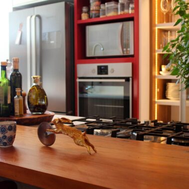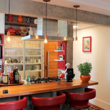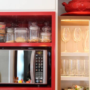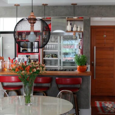 Desenvolvemos a marcenaria pensando em cada objeto e equipamento que eles possuíam ou desejam ainda comprar para o apartamento já reformado. Durante o acompanhamento da obra, fizemos uma descoberta incrível, a possibilidade da redução da dimensão de um falso pilar. Coisa que só se descobre na hora do quebra-quebra mesmo. Isso possibilitou a revisão e melhoria do layout inicial e deixaram os clientes muito satisfeitos.