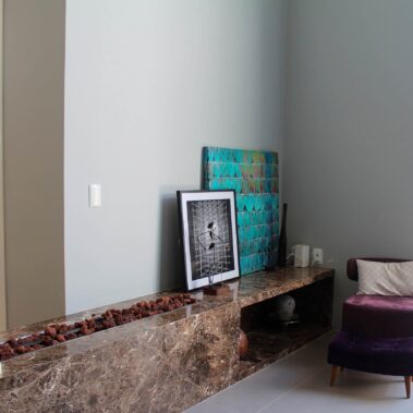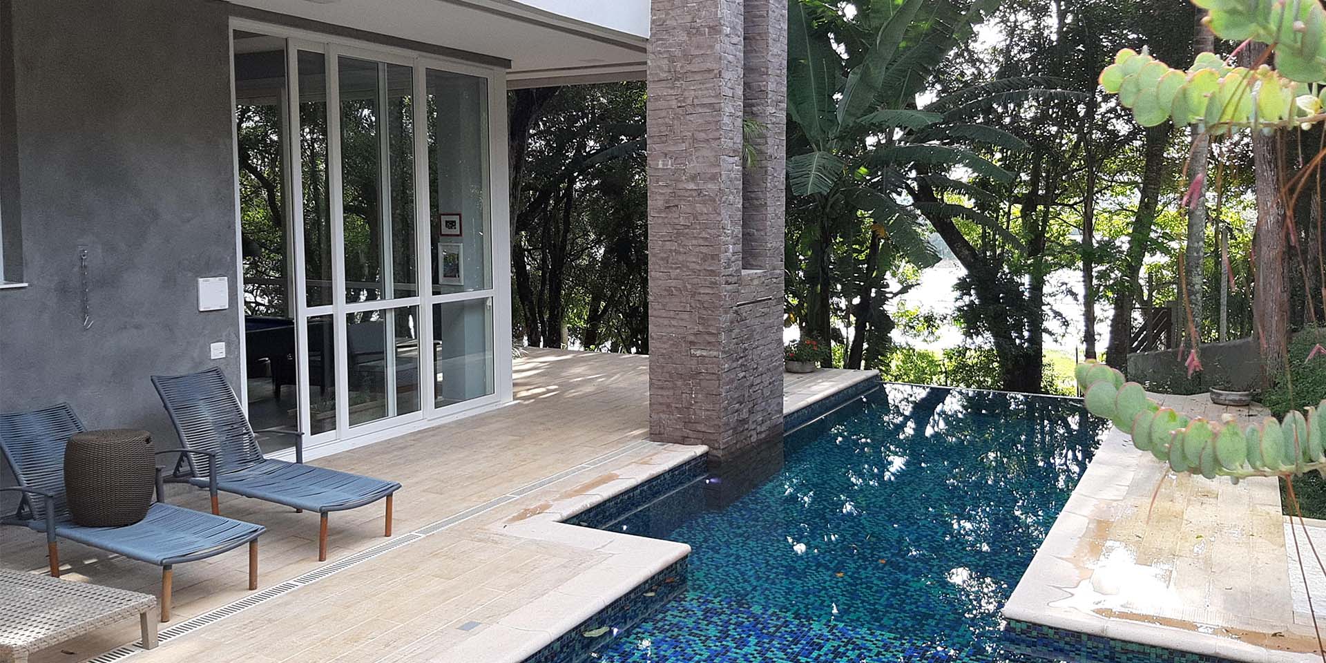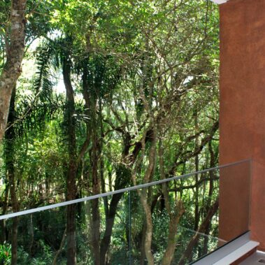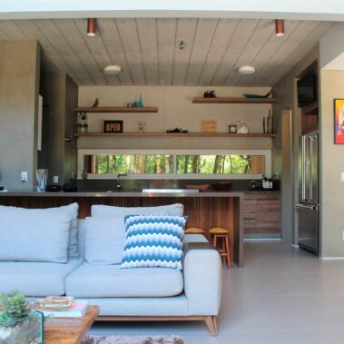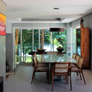 Uma casa de campo cercada por uma vegetação exuberante e vistas que acalmam o espírito desde as janelas dos banheiros aos grandes vãos na área social. Uma arquitetura com jogo de volumes e cores que se conecta com a natureza por meio de grandes aberturas, varandas e materiais em sua integridade como o cimento, a madeira e a pedra.