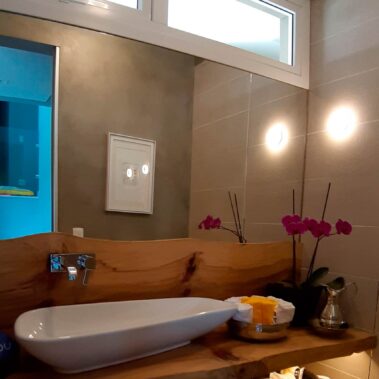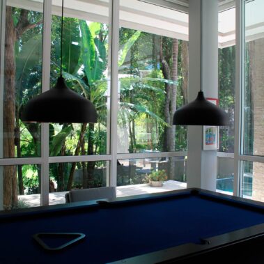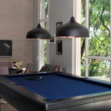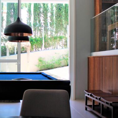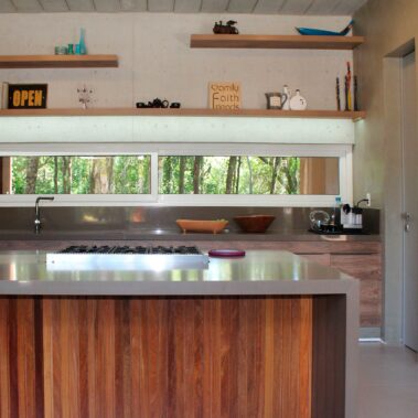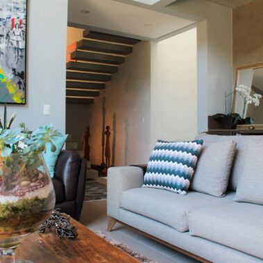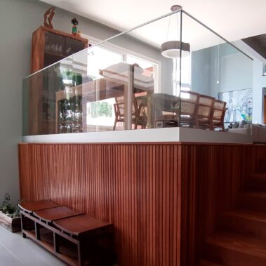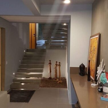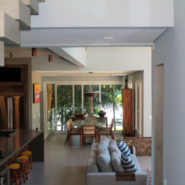 Devido à declividade do terreno e buscando uma menor intervenção na morfologia natural do mesmo, projetou-se o acesso em nível intermediário, ou seja, descendo meio lance de escadas para a área social e subindo meio lance para os quartos. Dessa maneira, tem-se um ritmo e volumes que se descobrem aos poucos ao se passear pelos ambientes bem arejados e iluminados.