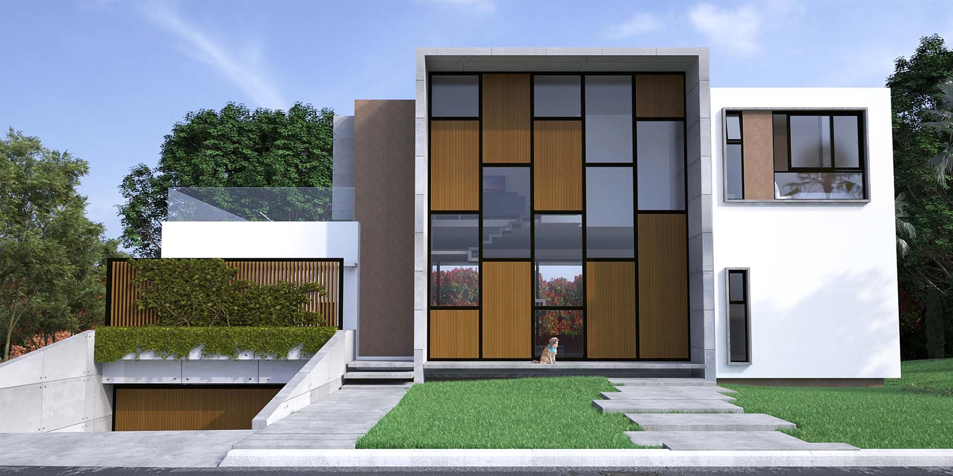 Por isso, neste projeto todos os elementos em concreto são aparentes e recebem um tratamento especial para resistirem em meio à mata. Com muitos painéis em vidro, utilizamos madeira para criar fechamentos para dar certa privacidade, como é o caso do painel principal da entrada e da varanda posterior.
