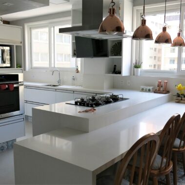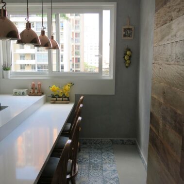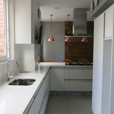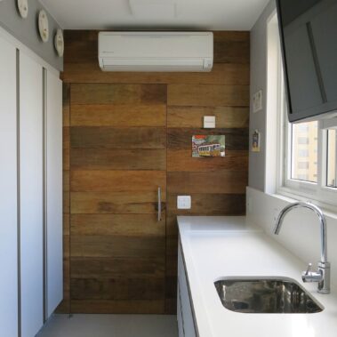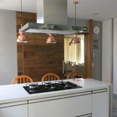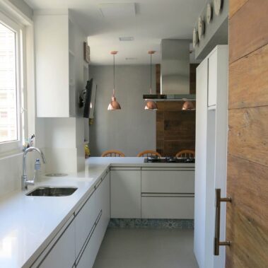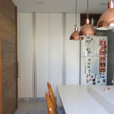 O partido de projeto foi uma cozinha ampla, clara e prática para realmente se contrapor à cozinha antiga, que tinha muitas subdivisões e era escura. Deste modo, propusemos bancadas em pedra industrial e mobiliários brancos, com exceção do uso da madeira de demolição nas portas e painéis. Buscando também mais luz para o ambiente, substituímos os caixilhos antigos de ferro e vidro martelado por pvc branco e vidro liso, permitindo além de mais luminosidade, maior visibilidade do exterior.