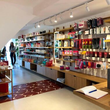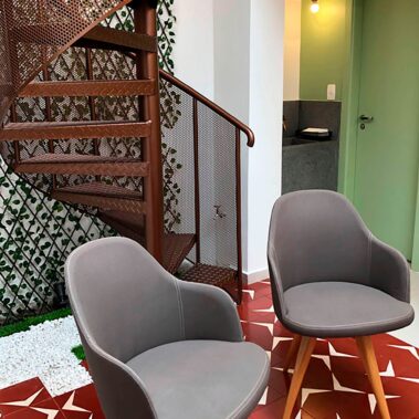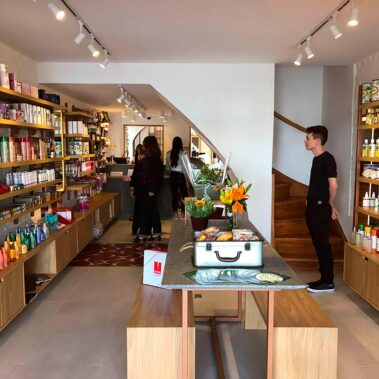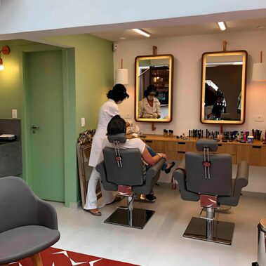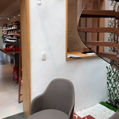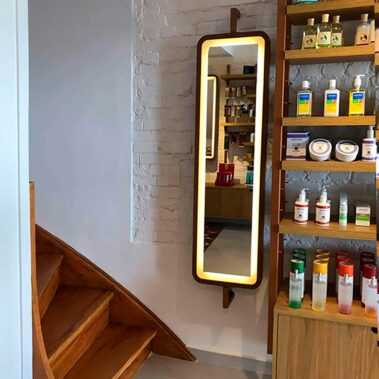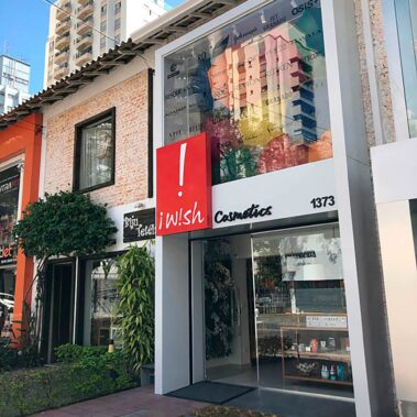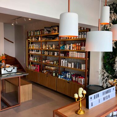 Sendo o tema da loja cosméticos e os clientes desejarem um ar romântico e intimista, mas também requintado, mesclamos paredes descascadas no interior e exterior, com os tijolos visíveis, e ladrilho hidráulico no piso em pontos especiais, como no jardim do fundo, com muitos elementos metálicos no tom cobre. A cor aparece no mobiliário, nas luminárias de parede, na escada helicoidal no jardim, além de outros pequenos detalhes. O mobiliário foi todo desenhado especialmente para a loja, mesclando mdf no padrão madeira, estruturas metálicas em cobre e granito rústico cinza, com é o caso do móvel do caixa e da bancada que dá apoio ao salão de maquiagem no fundo.
