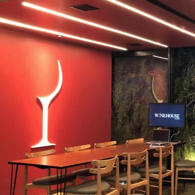Do lado externo, no clube de vinhos, criamos um “box” todo vermelho por dentro e em réguas de pinus tratado por fora. Neste box, ficam a sala privativa para administração do clube, que é a única sala que possui fechamentos em vidro. Temos mais duas salas de conferência com 8 lugares cada e uma sala que funciona como um pequeno lounge, logo à frente do bar. A recepção, a área para grandes projeções e o bar ficam soltos abaixo da cobertura translúcida existente, assim como o estoque que foi construído ali.